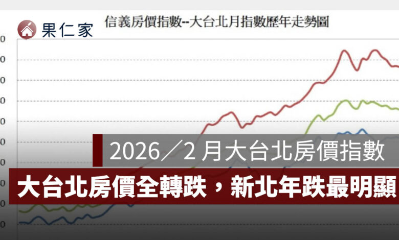 2026/2 月大台北房價指數:大台北房價全數轉跌,新北年跌 3.3% 最明顯