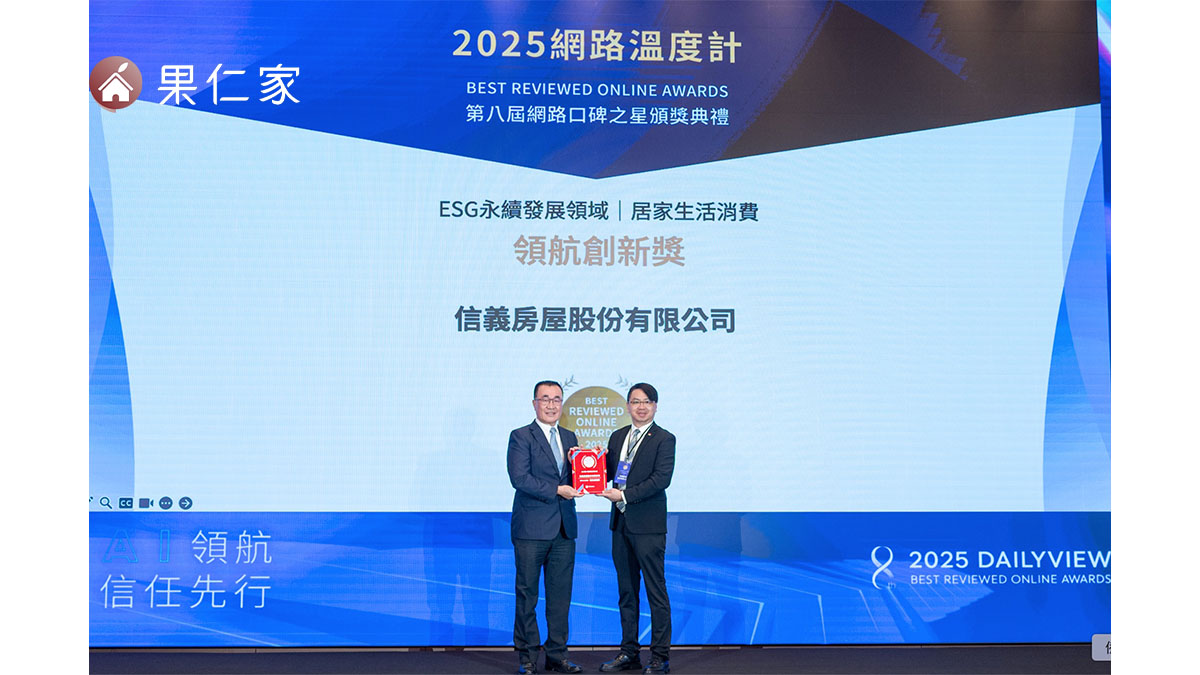 以「 AI 領航、信任先行」為主題的第八屆「網路口碑之星」於 2025 年 10 月 21 日舉行,聚焦企業在數位轉型與永續實踐的表現。信義房屋勇奪「 ESG 永續發展領域居家生活消費類」領航創新獎,為房仲業唯一獲獎品牌。此肯定不僅來自行動與數據,更來自長年落實誠信治理、社區行動與數位創新,展現從居住服務到社會共好的全方位實力。