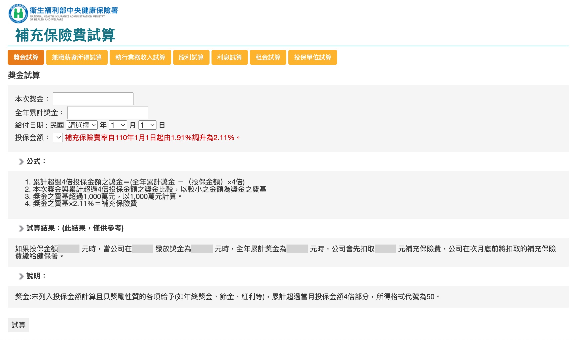 若新制確定上路,之後也可以透過「補充保費試算網頁」計算,頁面如下: