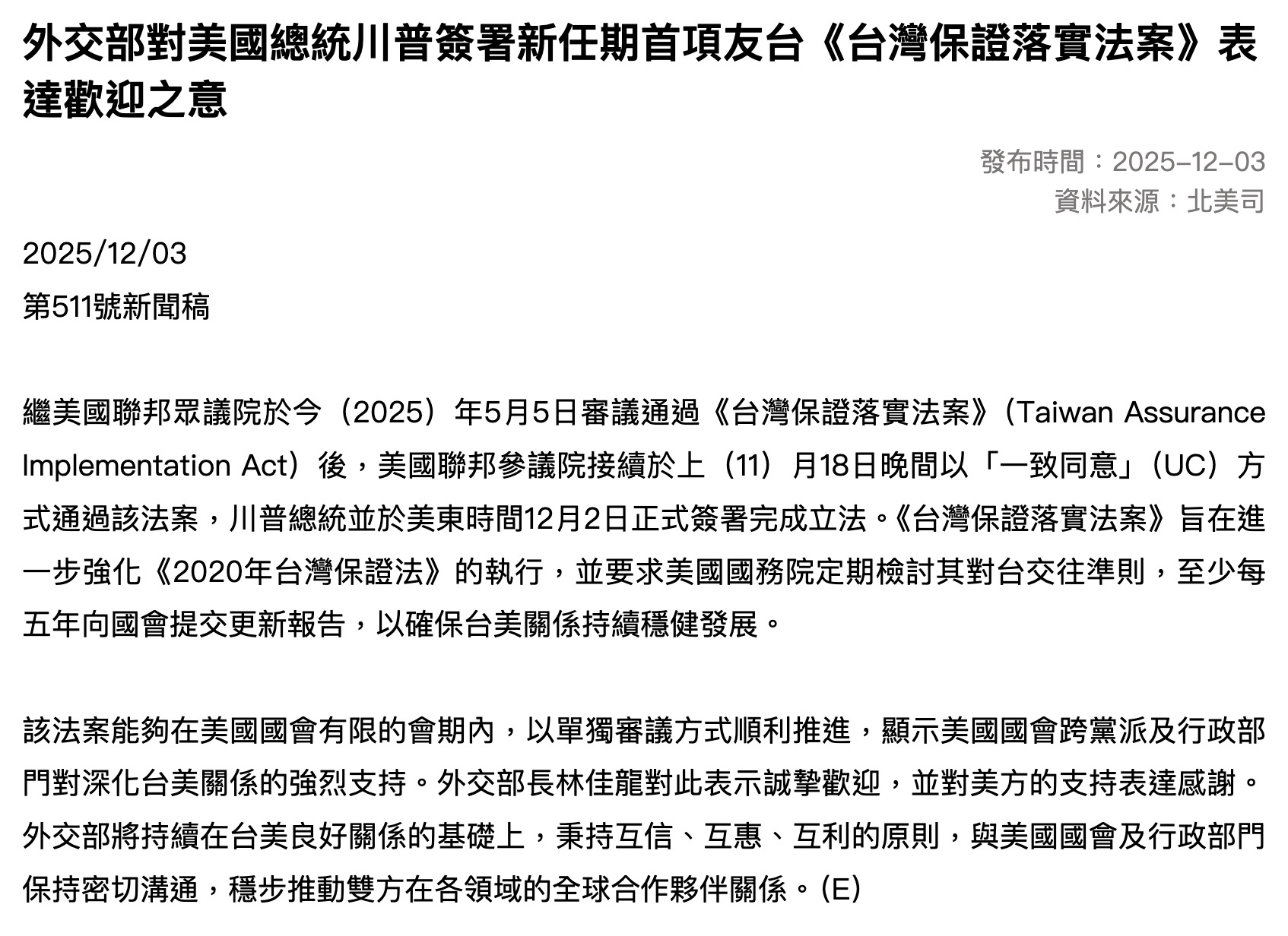 美國總統川普在 2025 年 12 月 2 日正式簽署《台灣保證實施法案》(Taiwan Assurance Implementation Act, H.R.1512),法案當天立刻生效,成為美國法律。本文整理《台灣保證實施法案》是什麼?以及《台灣保證實施法案》3 大重點與對台美關係影響。
