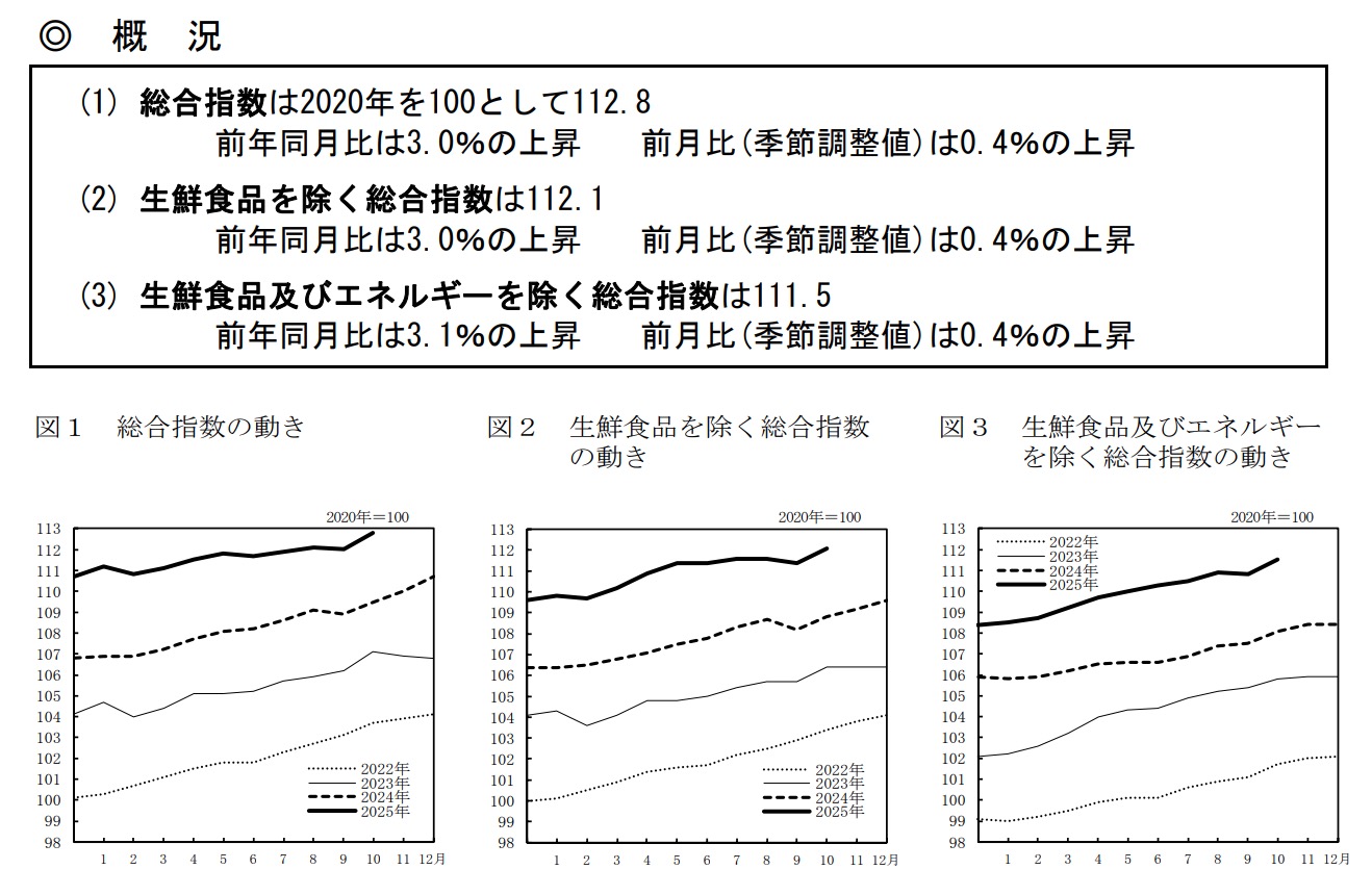 日本總務省公布,2025 年 10 月全國消費者物價指數(CPI,以 2020=100)總合指數來到 112.8,年增率約 3.0%,比 9 月的 2.9% 再稍微往上,季調後月增約 0.4%。