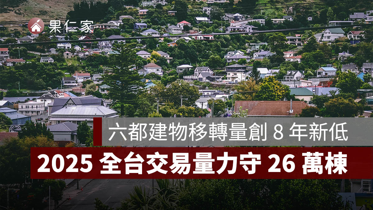 根據六都地政局最新統計,六都建物買賣移轉棟數 2025 年約 20.5 萬棟,寫下 8 年以來的新低量, 12 月六都的建物買賣移轉棟數則是 2 萬棟,月增幅度達到 25%,以六都約佔全國 8 成的移轉棟推估, 2025 年全台的建物買賣移轉棟數有望保住 26 萬棟。