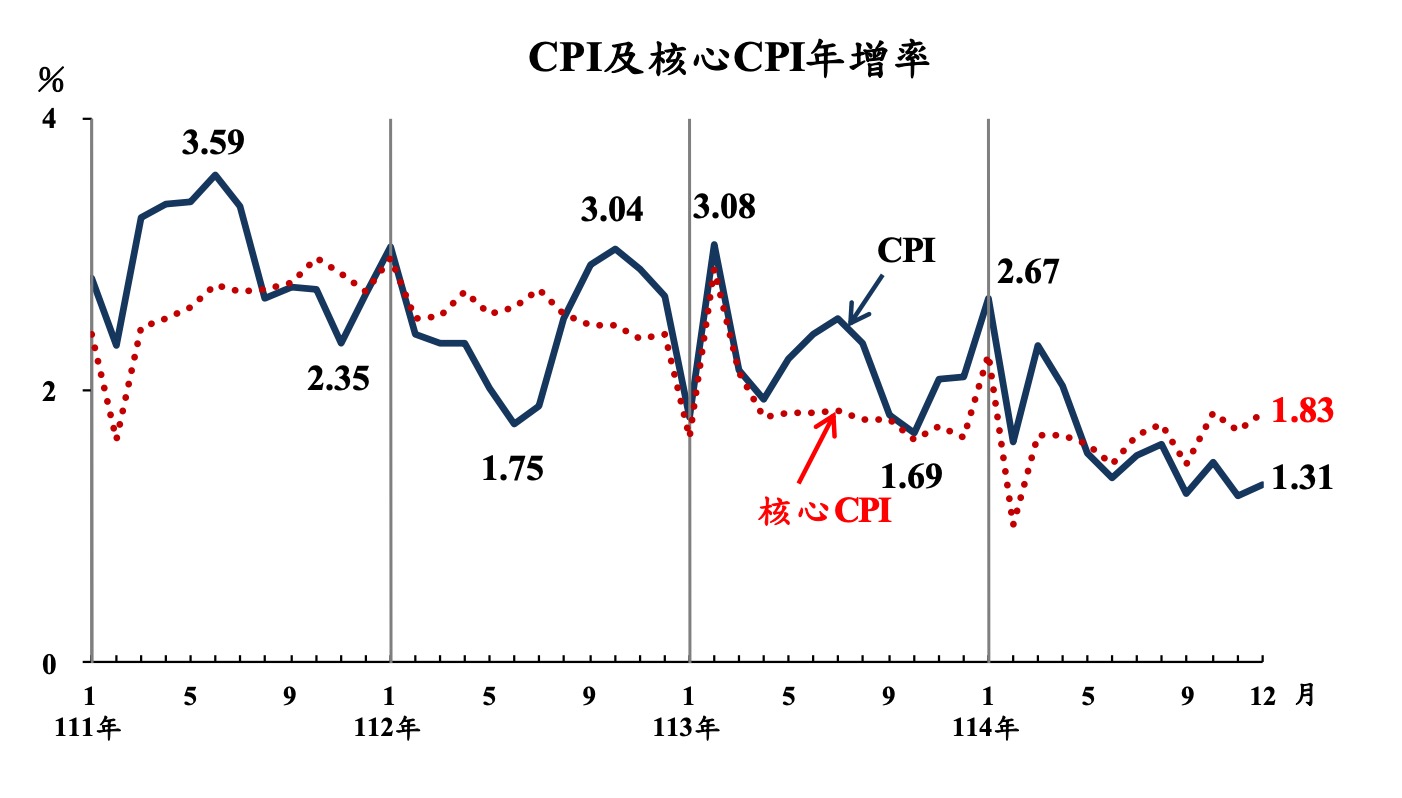 12 月 CPI 年增 1.31%,核心 CPI 仍偏高