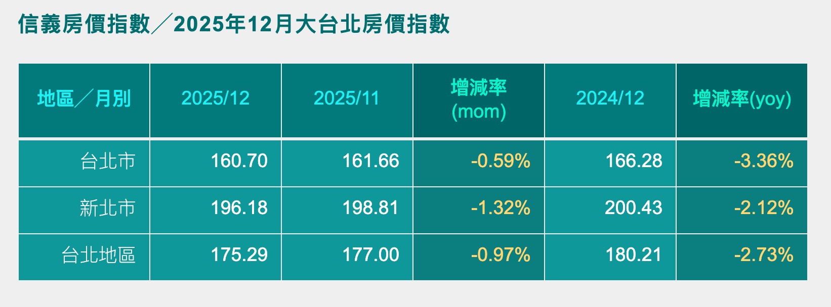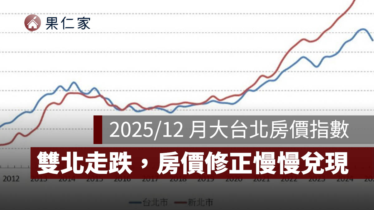 2025/12 月大台北房價指數:台北市年減 3.36%、新北同步走跌,房價修正慢慢兌現
