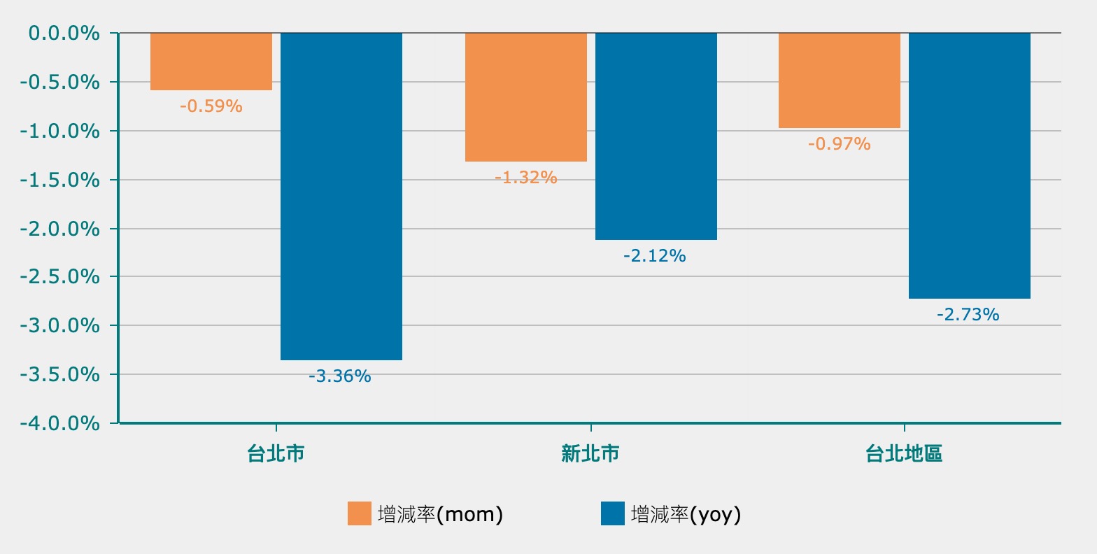 若以整體台北地區(台北市+新北市) 觀察,12 月房價指數為 175.29,較前一月月減 0.97%,與去年同期相比年減 2.73%。