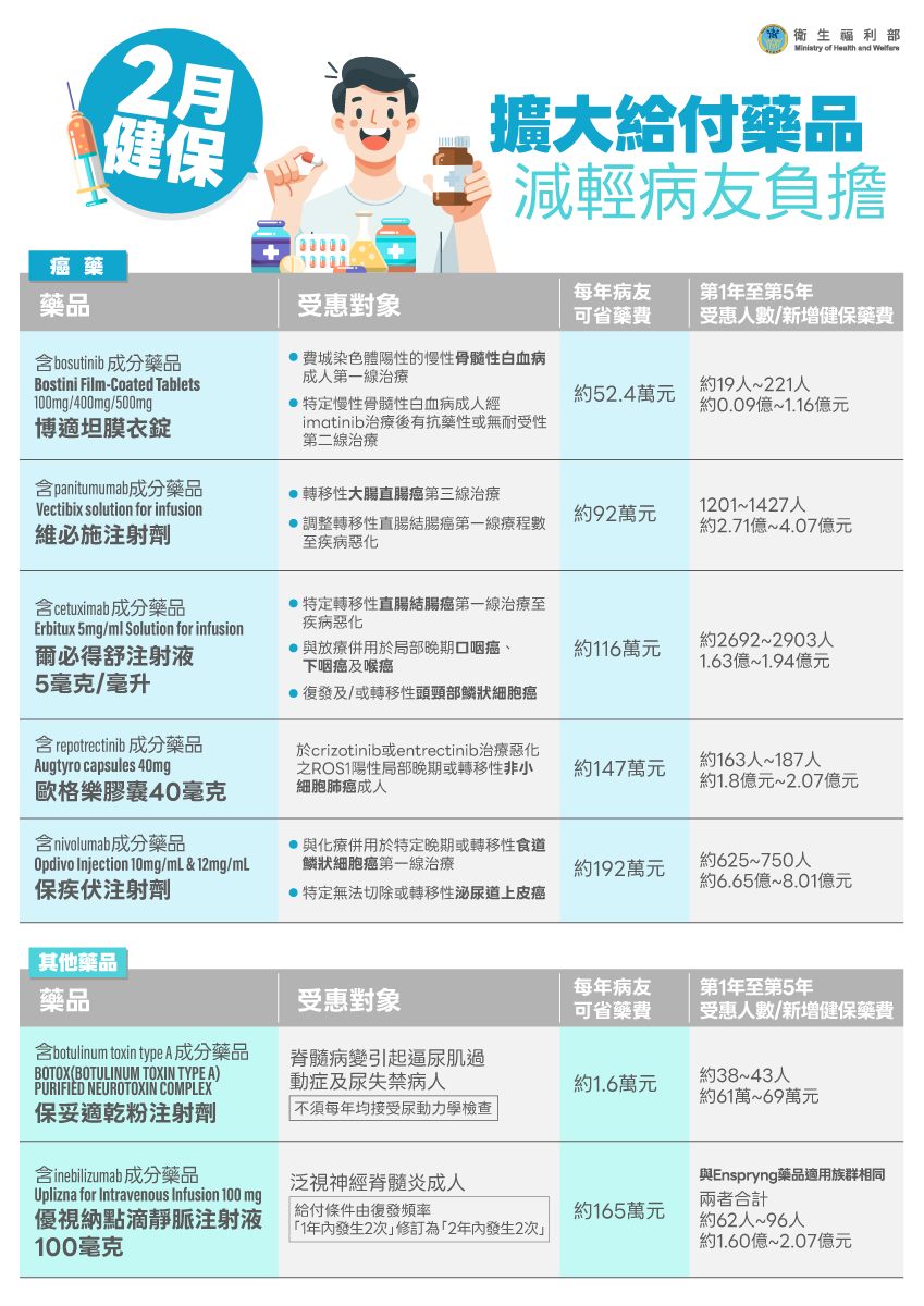 2 月起新增與擴大多項癌症標靶藥與免疫治療藥物健保給付,涵蓋乳癌、肺癌、大腸直腸癌等,並投入約 4,000 萬元強化乳癌病友照護品質,有助減輕患者自費負擔。