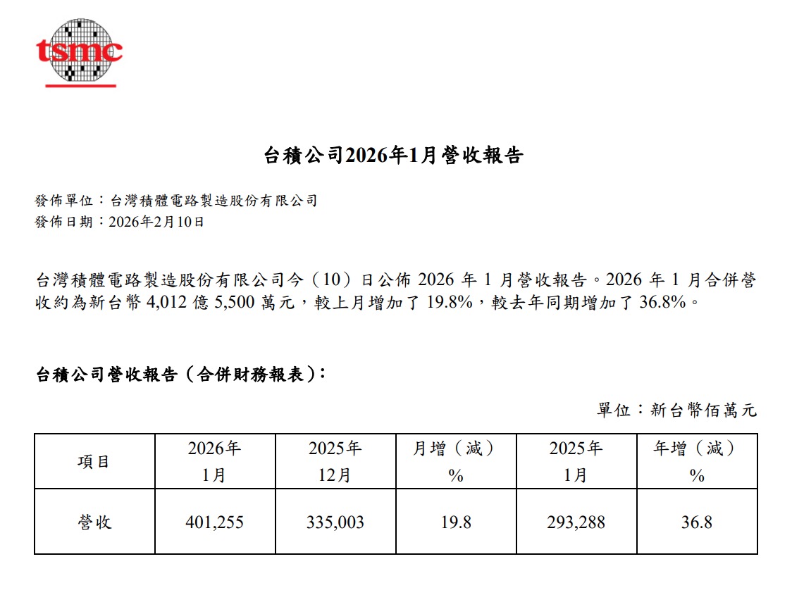 2026 年開年首月,台積電繳出亮眼成績單。根據公司 2 月 10 日公告,2026 年 1 月合併營收達新台幣 4,012 億 5,500 萬元,較上月成長 19.8%,較去年同期大幅成長 36.8%,創下歷年 1 月同期新高紀錄。在全球半導體景氣循環逐步回溫、AI 需求持續擴張的背景下,台積電的單月營收表現也被視為觀察科技產業動能的重要指標。