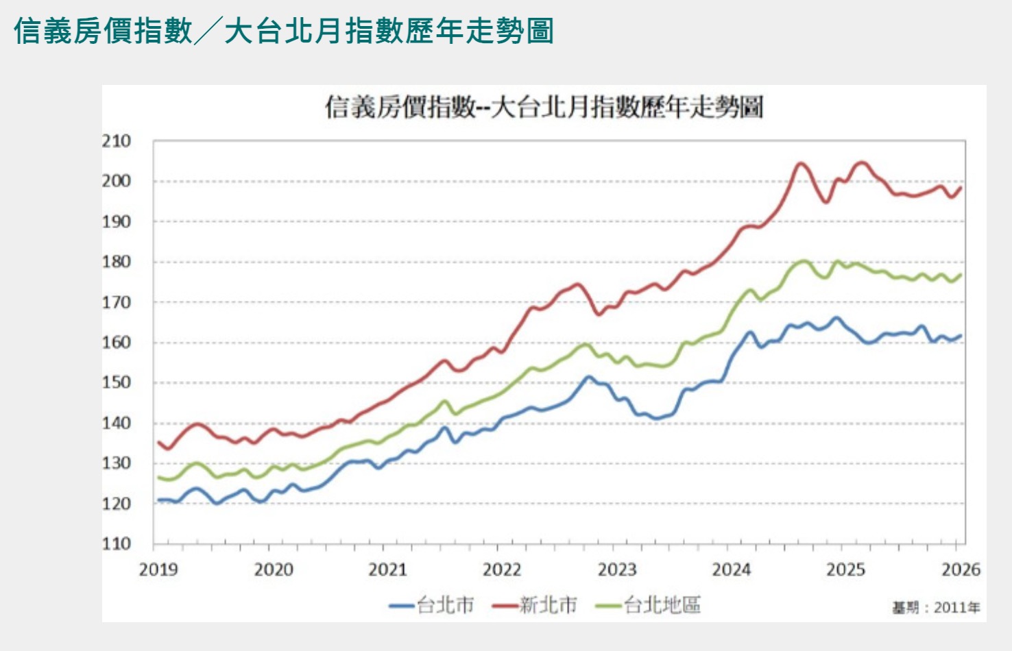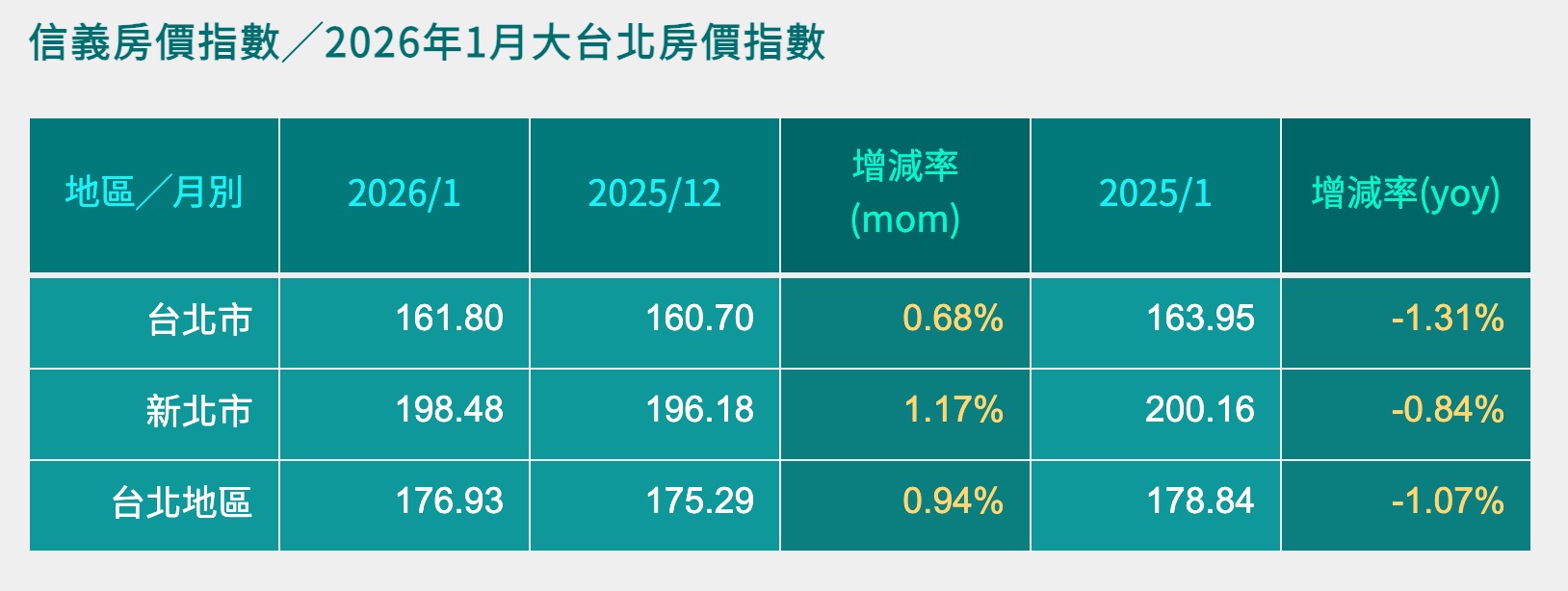 2026/1 月大台北房價指數:雙北月增轉正、年減收斂,大台北房市進入盤整回溫期