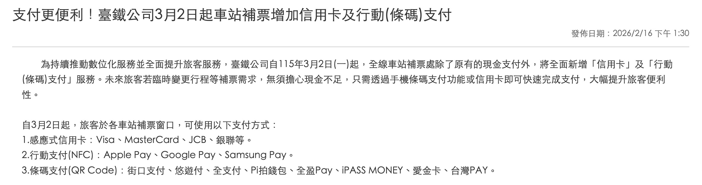 2026 三月新制:台鐵購票與補票全面數位化