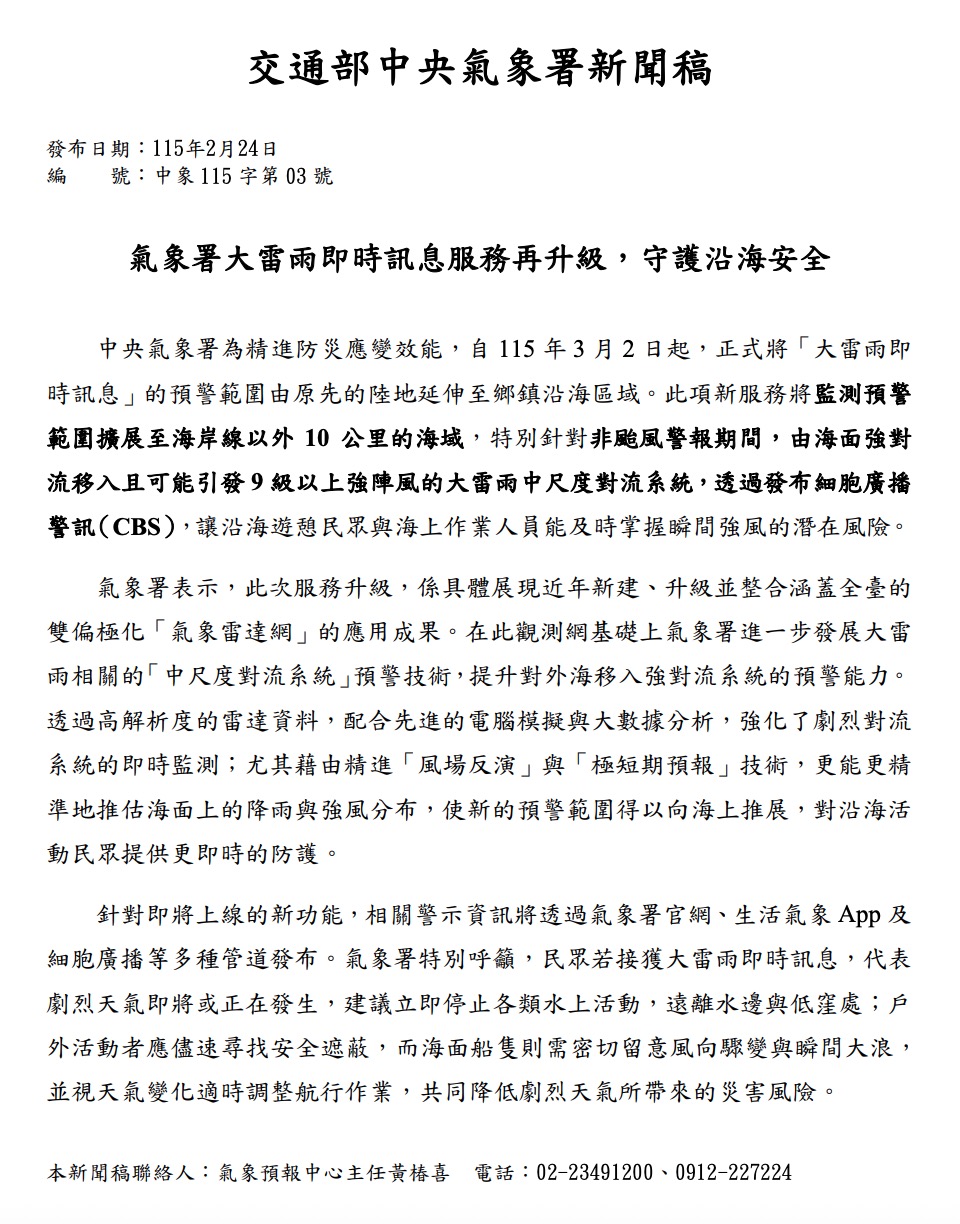 氣象單位自 3 月 2 日起,將大雷雨即時警訊範圍擴及沿海區域,透過細胞廣播發送通知,提高防災即時性。