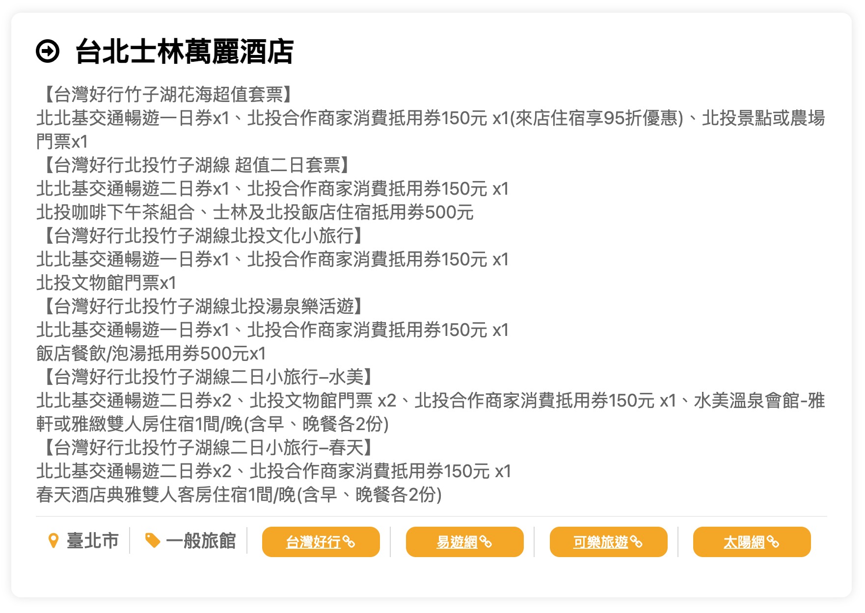 下方以台北士林萬麗酒店為例,列出交通優惠項目,大家也可以前往「台灣旅宿網」的「台灣好行優惠套票」,進一步查詢想前往的縣市的優惠項目。