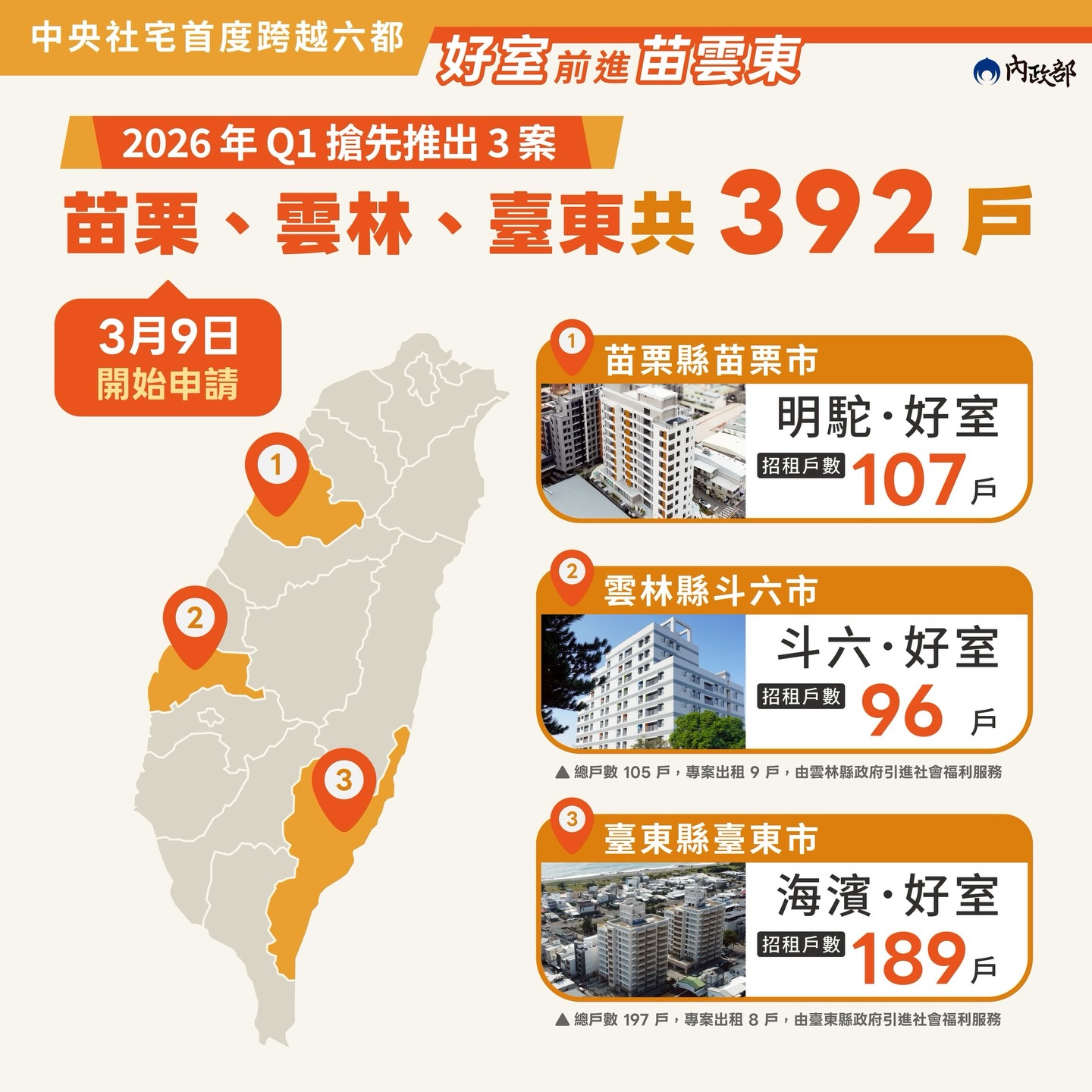 這次中央首度在六都以外推出的新建社宅,共有 3 案,分別是苗栗縣苗栗市的「明駝好室」、雲林縣斗六市的「斗六好室」,以及臺東縣臺東市的「海濱好室」。