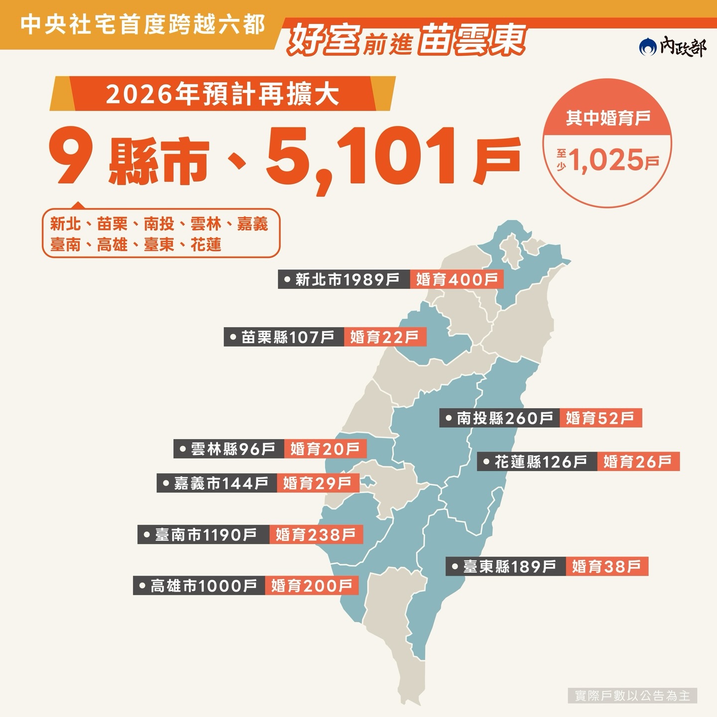 這次招租先推出苗栗、雲林、臺東 3 案共 392 戶,但從目前公布規劃來看,2026 年中央社宅還會進一步擴大到 9 縣市、合計 5101 戶,其中婚育戶至少 1025 戶。