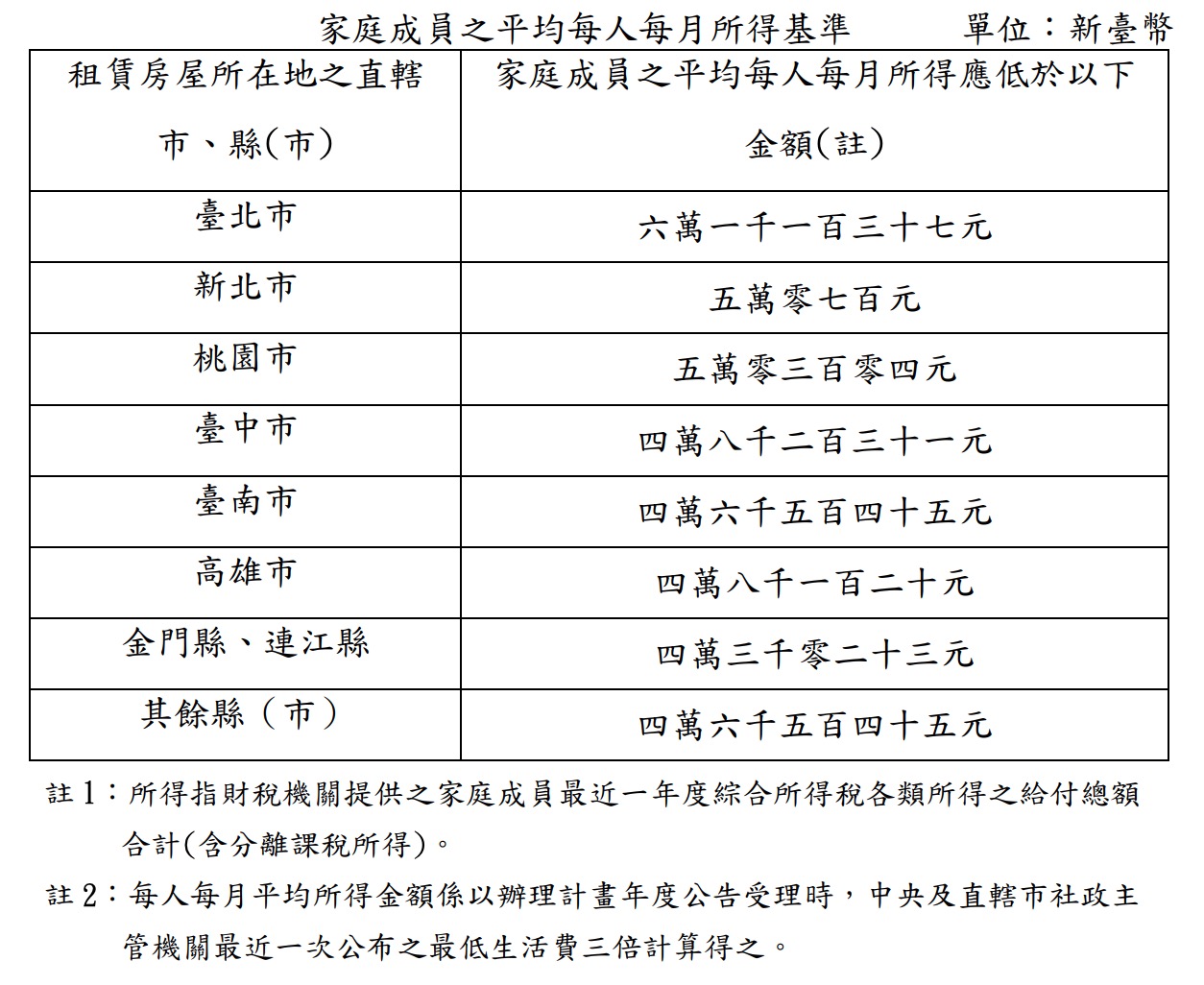 申請 115 年租金補貼,家庭成員平均每人每月所得,必須低於租屋所在地最低生活費的 3 倍。