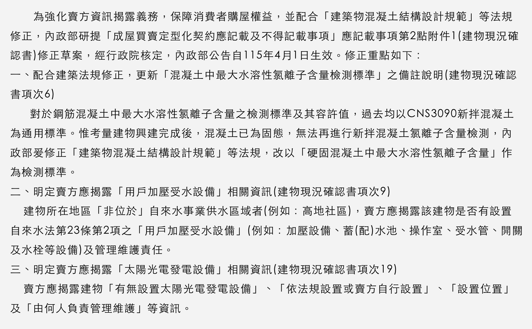 | 成屋買賣資訊揭露新制 | 2026 年 4 月 1 日 | 賣方出售成屋時,須在建物現況確認書揭露混凝土氯離子含量、加壓受水設備、太陽光電設備等資訊 |