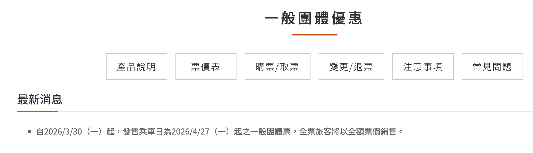 | 高鐵團體票優惠取消 | 2026 年 4 月 27 日 | 11 人以上一般團體票取消原本 95 折優惠,尖峰時段恢復原價 |