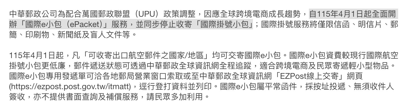 | 郵局停收國際掛號小包 | 2026 年 4 月 1 日 | 中華郵政停止受理國際掛號小包,改推國際 e 小包服務 |