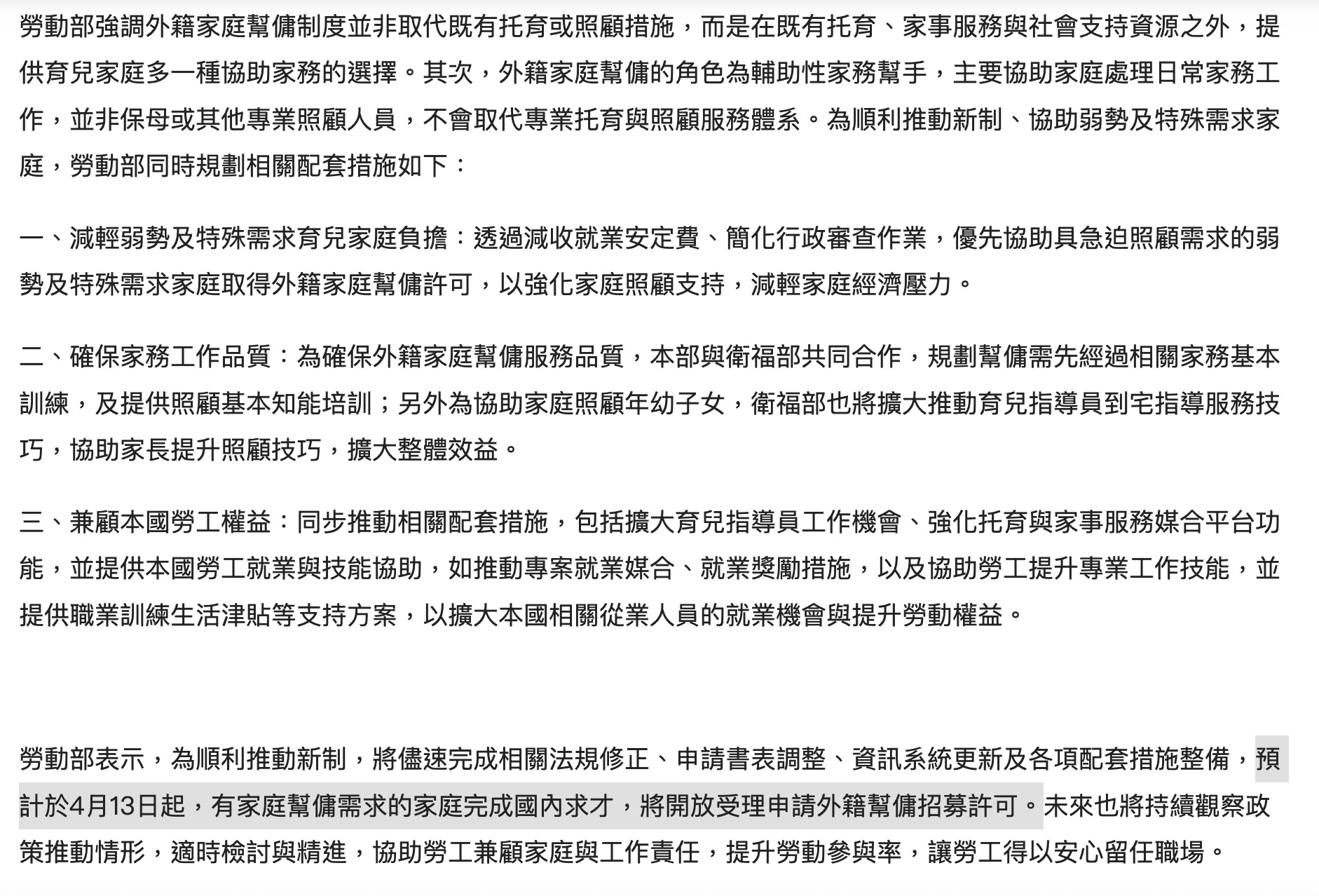 勞動部宣布,自 4 月 13 日起,外籍家庭幫傭申請資格放寬,只要家庭中有 1 名未滿 12 歲兒童,就可以申請外籍家庭幫傭,不再像過去一樣必須有 3 名幼兒。