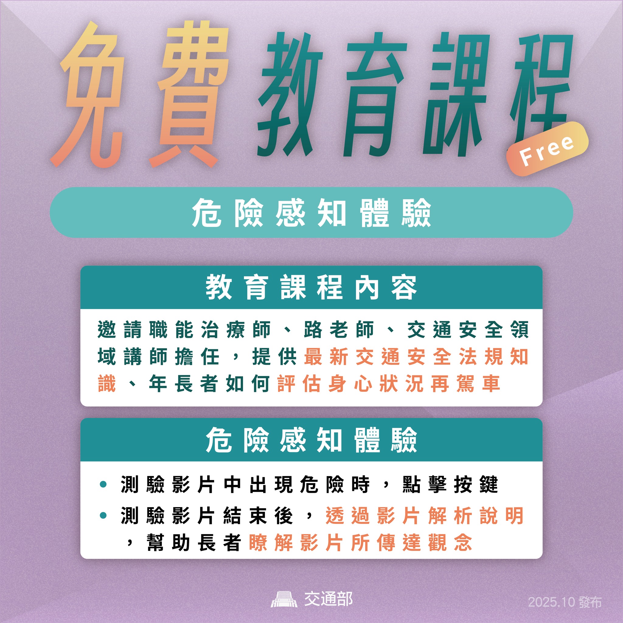 交通部這波高齡駕駛新制,不只改換照流程,也同步加入免費課程配套。115 年 5 月起將推動免費交通安全教育訓練,內容包括交通安全法規知識教育與危險感知體驗。
