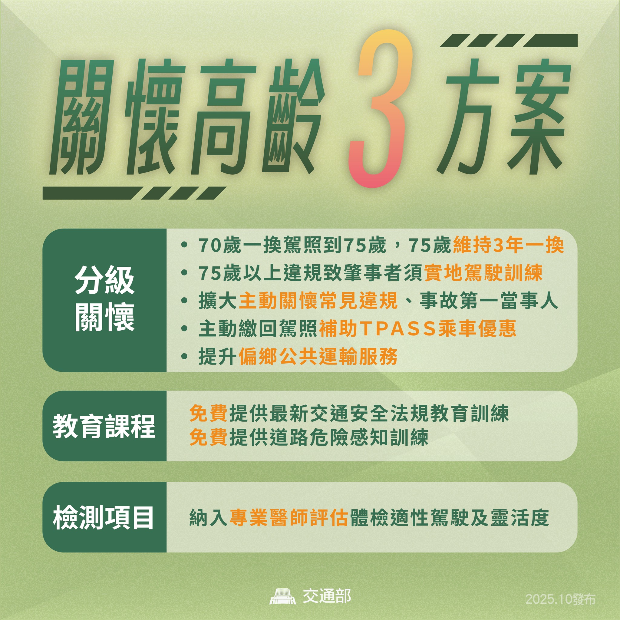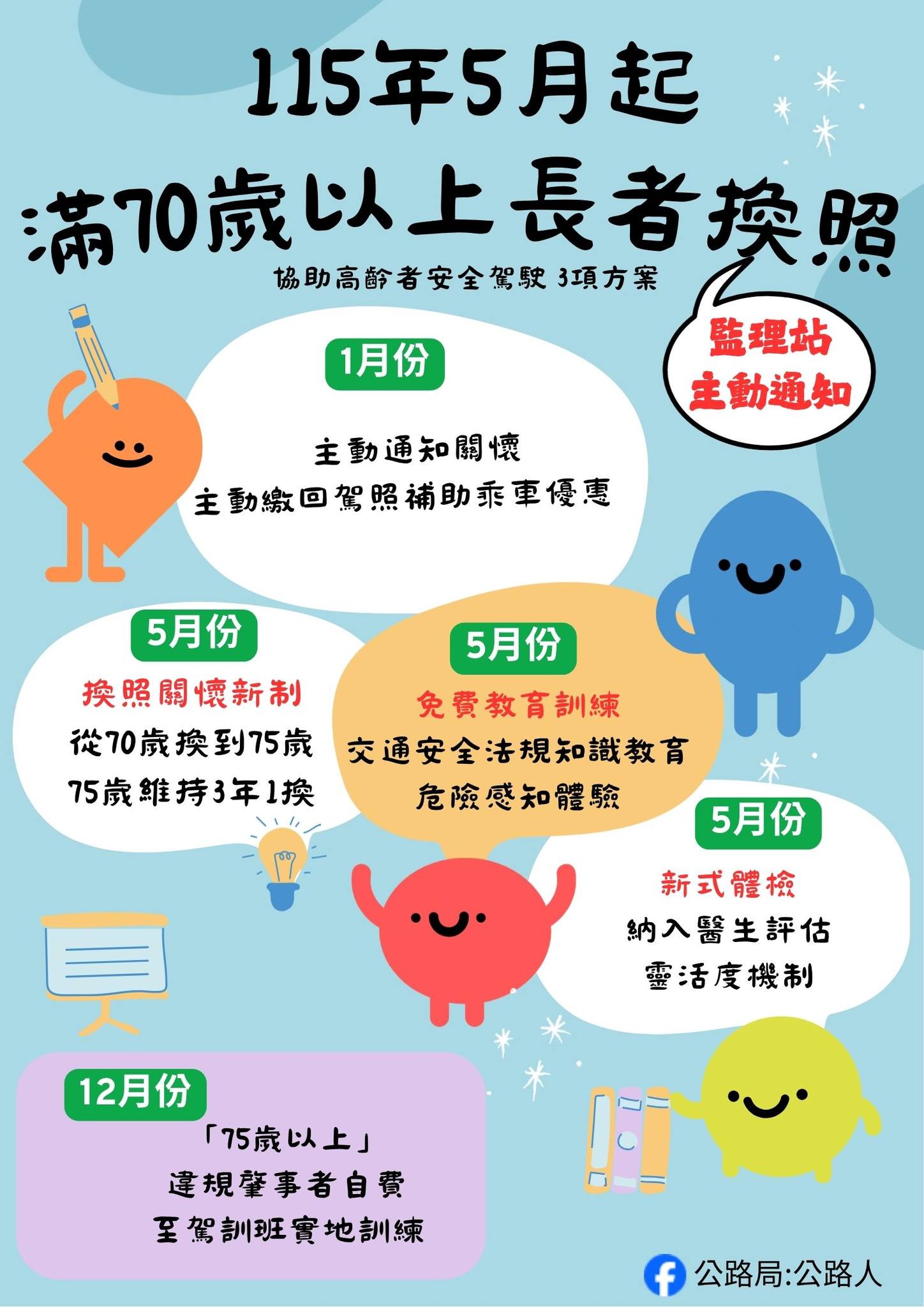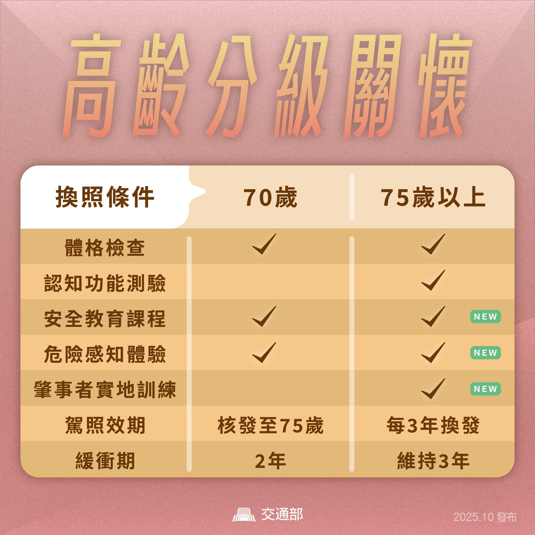 交通部這次推動的高齡換照新制,將從 115 年 5 月 1 日開始正式實施。新制上路後,滿 70 歲以上長者會納入新的換照關懷制度,換照前要完成專業醫師評估與體檢,另外也會同步推動免費交通安全教育訓練與危險感知體驗。