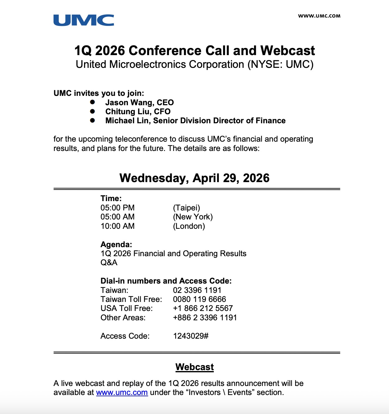 聯電(United Microelectronics Corporation,NYSE:UMC)將舉辦 2026 年第一季財報電話會議與線上直播,說明公司第一季財務與營運成果,並分享後續營運展望。