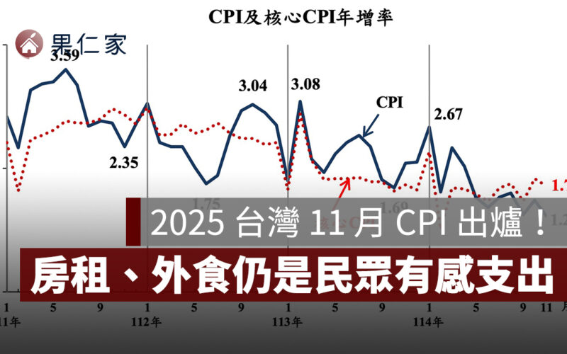 行政院主計總處公布 114 年 11 月物價變動概況,整體消費者物價指數(CPI)年增率來到 1.2